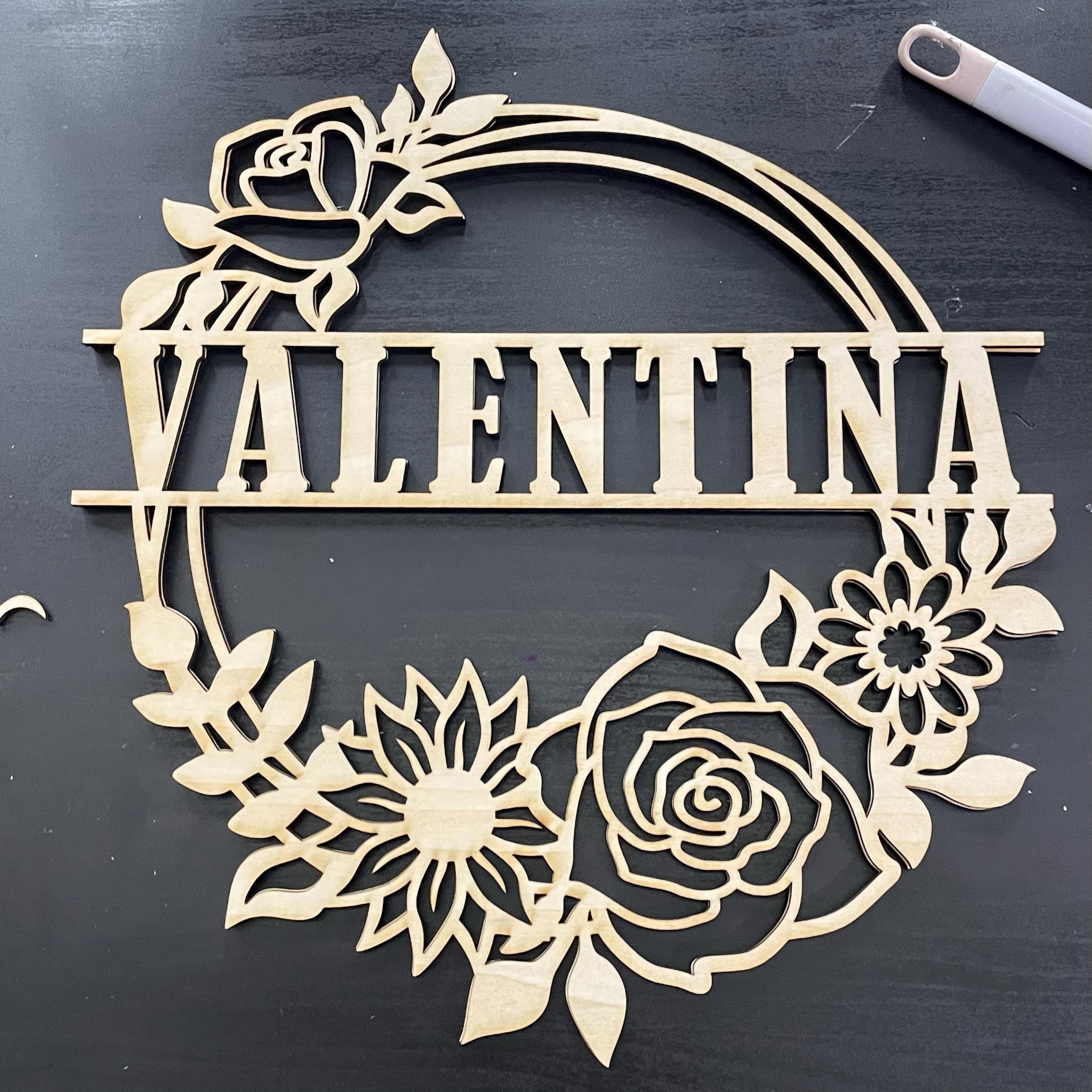 This flower wreath name sign is a digital laser cut template, perfect for creating a personalized floral-themed wall or door hanger. Ideal for kids or teens bedroom or nursery.