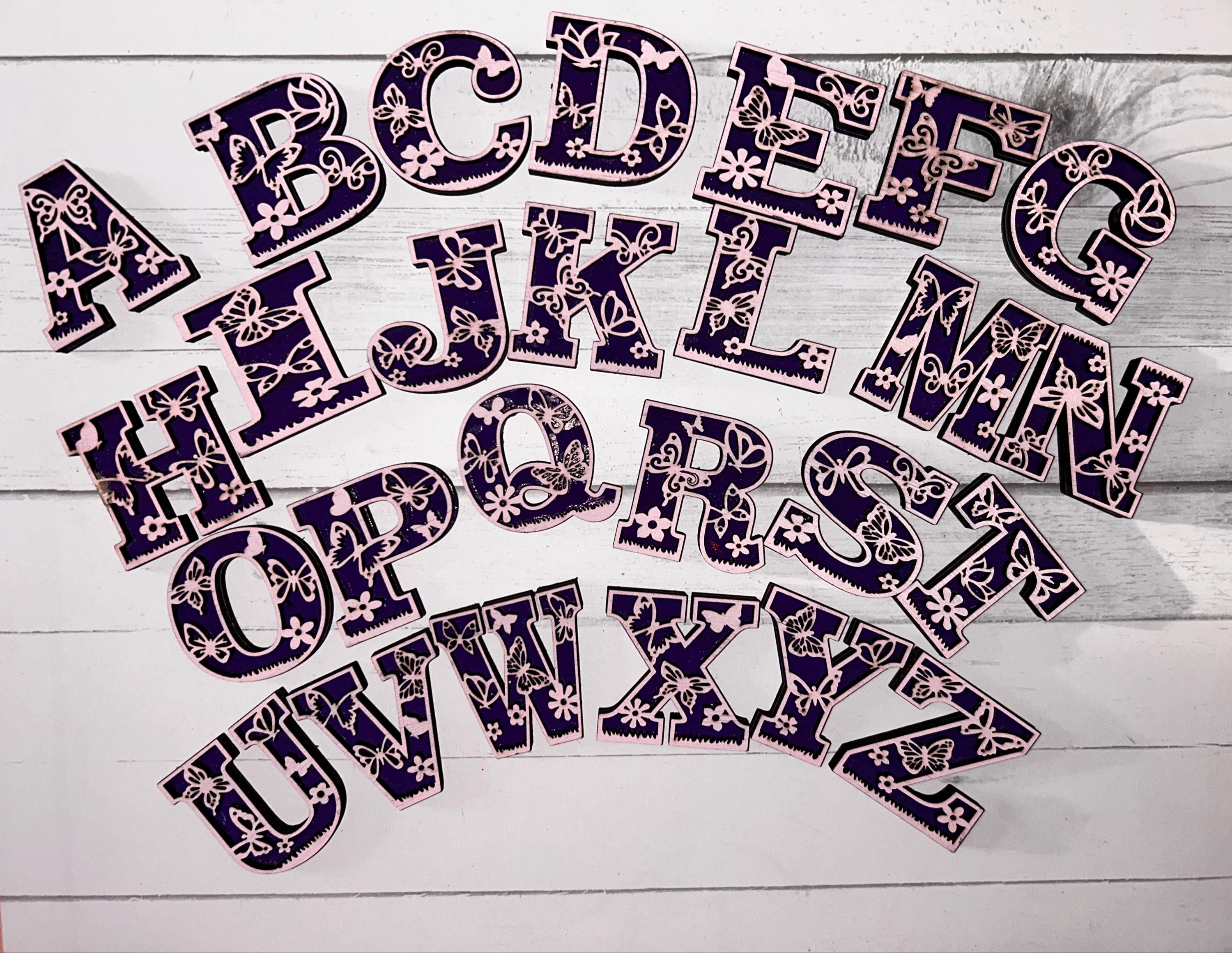 This digital download features 2 zip folders including 52 butterfly and flower letters. these letters work well as two layers (solid backing and detailed top) or just as a single layer. 1 folder with SVG, DXF, AI and CDR files, the other with each letter in PDF. these files have been designed laser machines and Craft Machines . in SVG, DXF, AI, CDR formats